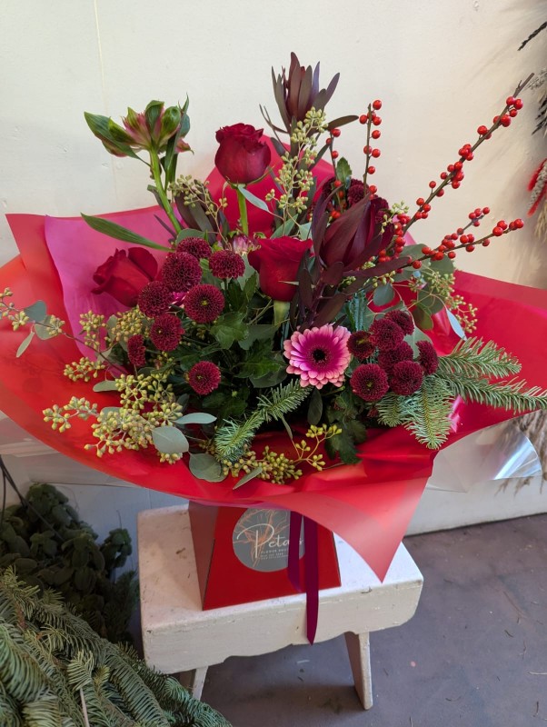 Created by our manager Nikki, this Florist's Choice Festive Bouquet blends luxury seasonal blooms with rich winter foliage to capture the true magic of Christmas. Known for her elegant colour palettes and thoughtful textures, Nikki's design features premium flowers, warm festive tones and layers of fresh festive foliage. Each bouquet is handcrafted in our Glasgow studio and finished with her signature attention to detail, making it a perfect Christmas gift or seasonal centrepiece. A beautifully balanced, long-lasting festive favourite from the Petals team. *Please note due to availability we may substitute flowers and flowers to the same value.